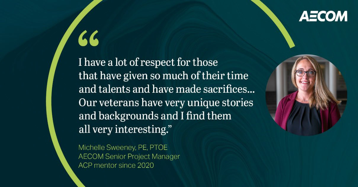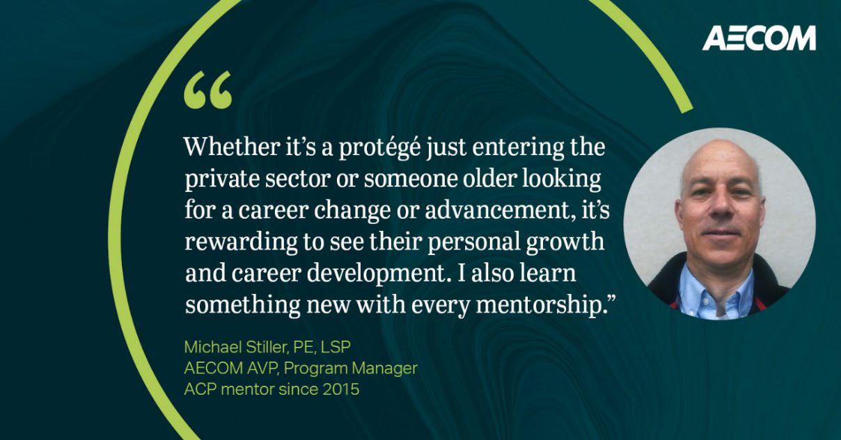 “It’s typical for veterans to question how much of their experience will be useful in the private sector,” said AECOM’s Michael Stiller, who started mentoring with ACP in 2015, “but the skills, work habits, communication, and many other aspects of their military background are significant positives for private sector capabilities.”