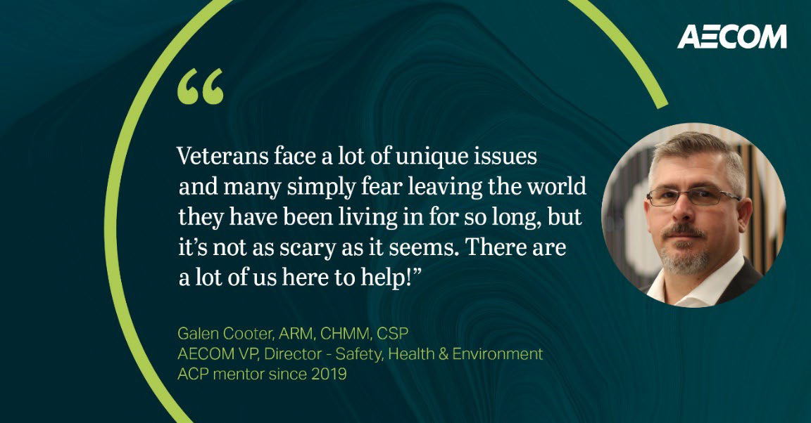 “This was a particular demographic where I knew my personal experience could have impact,” said AECOM’s Galen Cooter, who experienced his own difficulties in transitioning to the private sector after leaving the U.S. Marine Corps more than 16 years ago. “Veterans face a lot of unique issues,” he said, “and many simply fear leaving the world they’ve been living in for so long.”