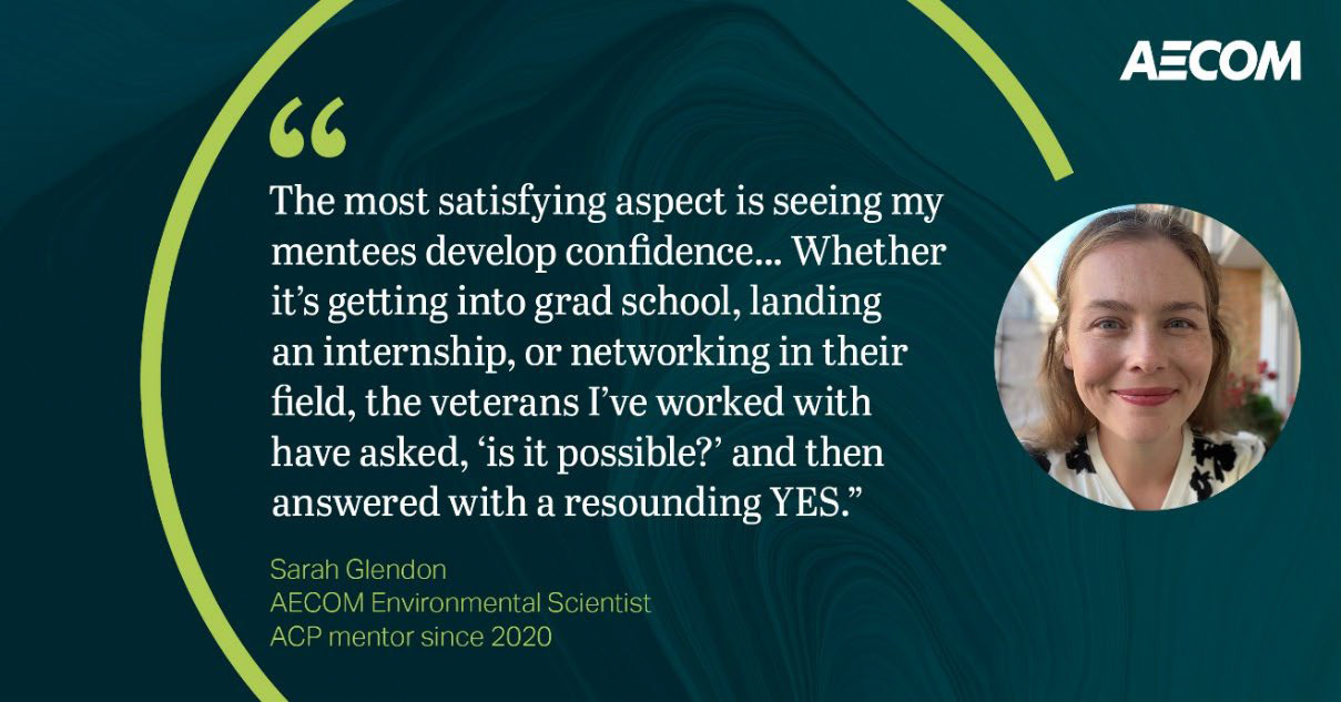 Both Montana and U.S. Army veteran Brent Johnson found help through ACP where they were paired with AECOM mentors. “The ACP mentorship program…provided me with a safe space where I could ask questions and receive guidance from a like-minded mentor within my career field,” said Brent.