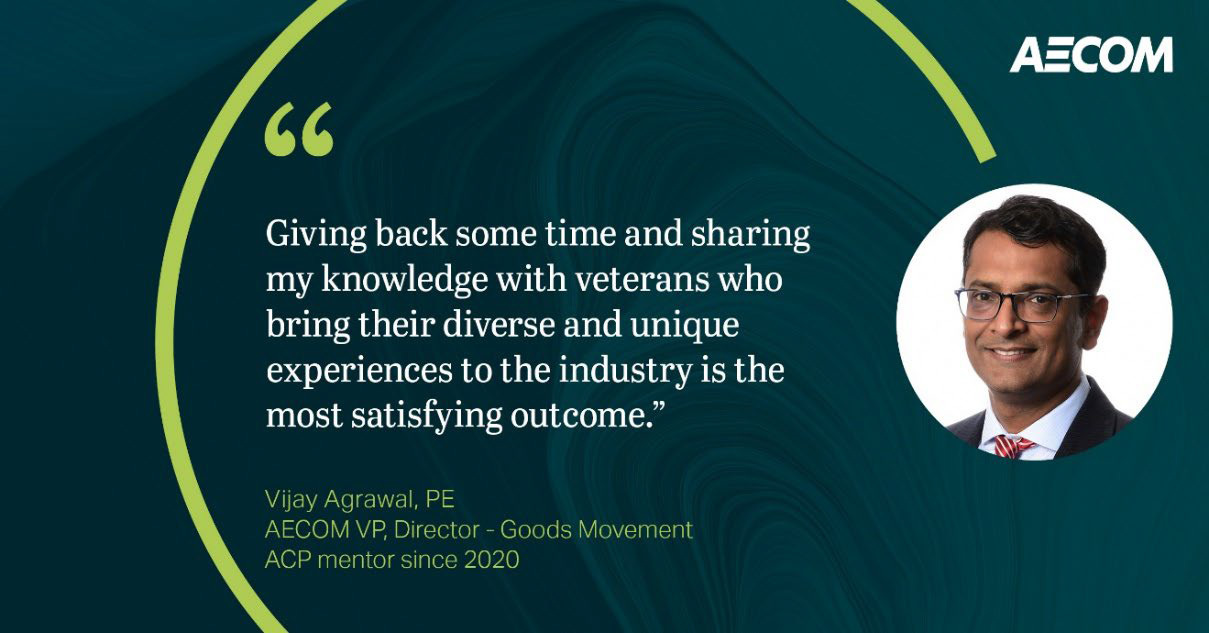 While many ACP mentors are veterans themselves, it isn’t a requirement for participation. Vijay Agrawal applied after taking a road trip with an AECOM colleague who’d previously transitioned from a career with the U.S. Army Corps of Engineers. “I learned from him that some veterans experience a lot of stress when trying to settle back into civilian life,” he said. “Giving back some time and sharing my knowledge with veterans who bring their diverse and unique experiences to the industry is the most satisfying outcome.”