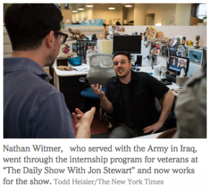 But after selling medical equipment for two years, he had the chance to join a five-week industry boot camp designed to bring young veterans into the television business. To his surprise, it was run by one of the Iraq war’s fiercest critics, Jon Stewart, the longtime host of Comedy Central’s “The Daily Show.”
