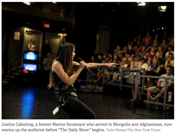 One of them is Justine Cabulong, a former Marine lieutenant who served in Mongolia and Afghanistan and is now a production coordinator at “The Daily Show” — a job that among other things includes a brief comedy routine before the show that warns audience members that if they don’t remain seated and keep their phones turned off, they “will be detained.”