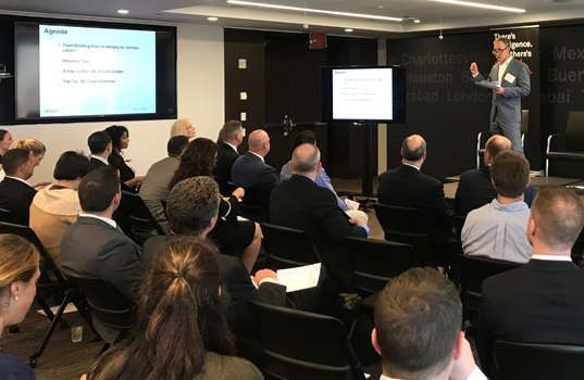 The event kicked off with opening remarks from Alex Matturri, the CEO of S&P Dow Jones Indices. Matturri welcomed attendees and handed it off to Patrick Sherry, the Director of Global Talent Acquisition. Sherry detailed his experience transitioning from the military to the corporate world and shared his advice on job searching, resumes, and networking.