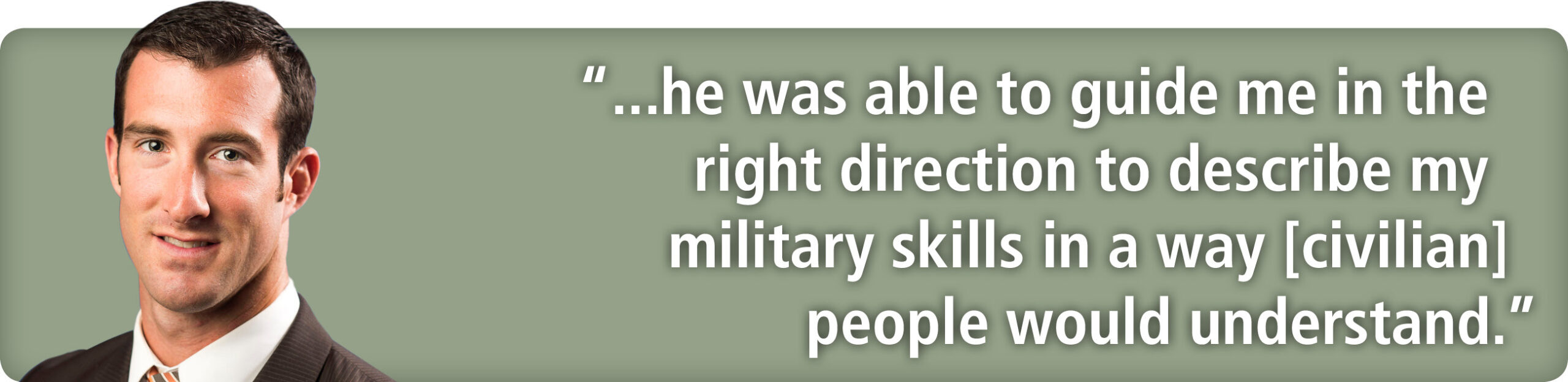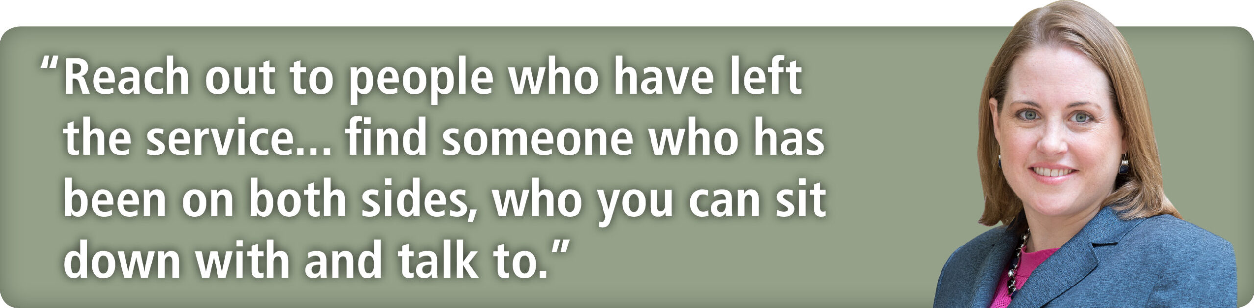 “Even reach out to people who have left the service,” she said. “One of the hardest things is to take the military jargon and translate it into meaningful terms for corporate America. So find someone who has been on both sides, who you can sit down with and talk to.”