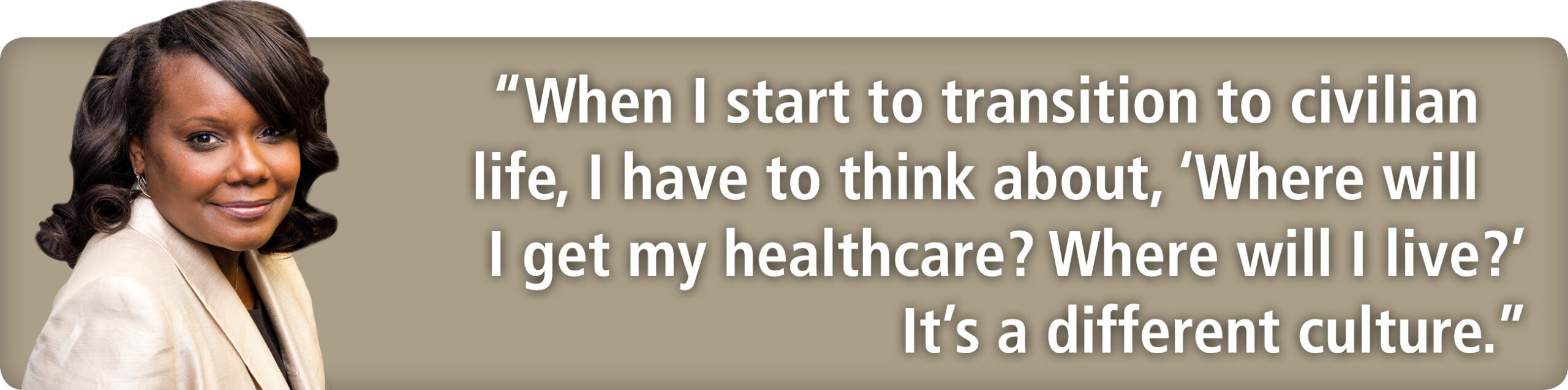 “The good thing about being in a military community is that everything is on the installation,” she said. “When I start to transition to civilian life, I have to think about, ‘Where will I get my healthcare? Where will I live—in a community that doesn’t identify with moving somewhere new every few years?’ It’s a different culture.”