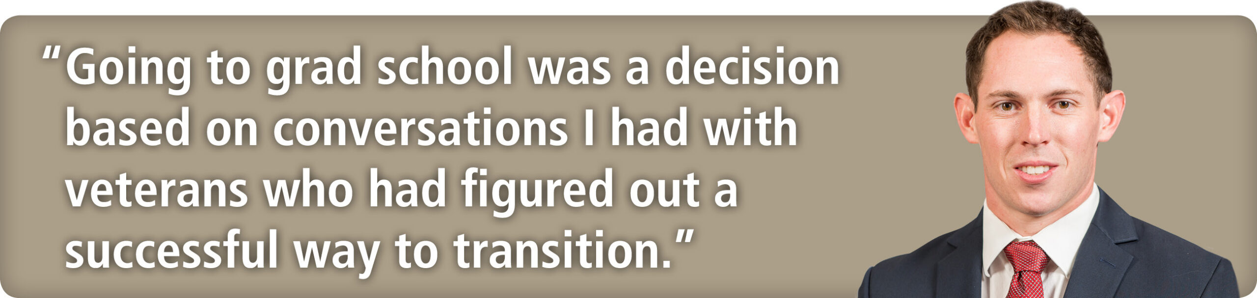“Going to grad school was a decision based on conversations I had with veterans who had figured out a successful way to transition,” he said. “The feedback was unanimous. Unless you were a doctor or an engineer or something like that in the military, you needed to get a master’s to show you have some skills that apply to civilian life.”